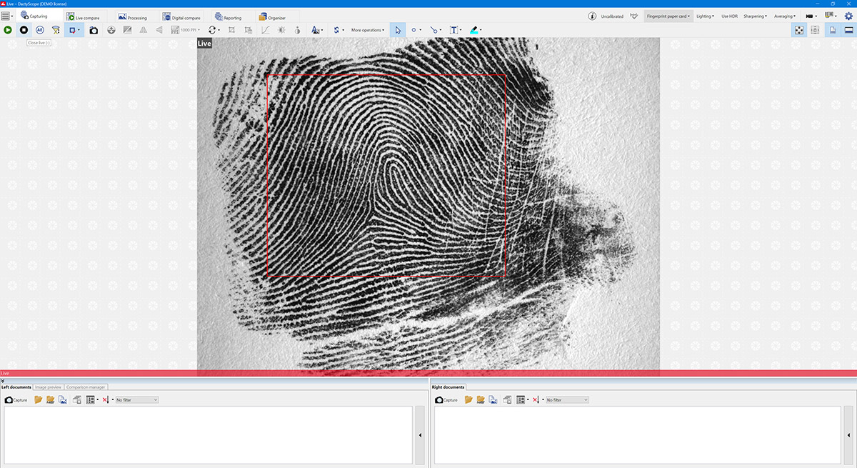 LUCIA Forensic is state of the art image processing and comparison software including a NIST-file module. The software comprises tools which cover all steps of image calibration, enhancement, documentation of traces, image comparison, and final report preparation. It can be used together with the capture station and provide direct control of camera real-time image, and capturing of images which are automatically calibrated based on the selected working distance.