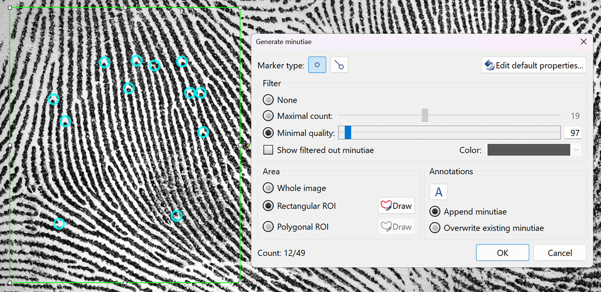 Automatic generation of minutiae: Choose between the maximal count of points or the minimal quality of points.